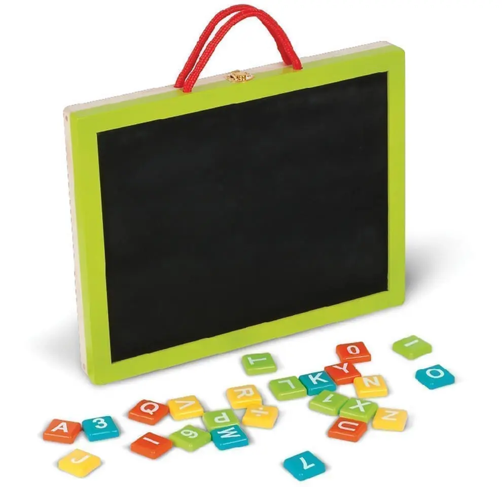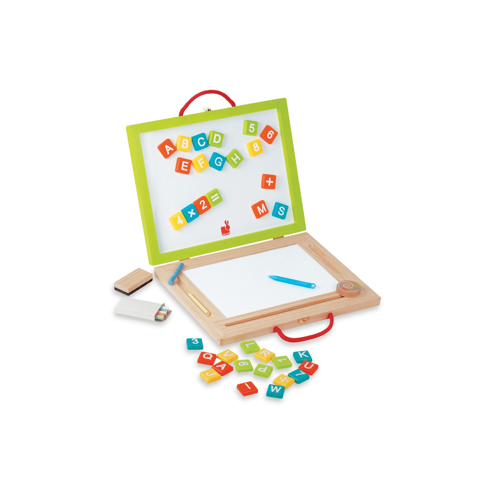 Janod 4 in 1 Magic Activity Case is a wooden case that offers 4 different ways for children to draw, write, learn and just have fun. Janod Activity Case has a blackboard on one side and a whiteboard on the other side. You then open up the case to reveal a magnetic whiteboard and a magnetic drawing pad (similar to an etch-a-sketch). Janod 4 in 1 Magic Activity Case also includes magnetic letters, numbers and simple mathematical symbols (+, -, =).