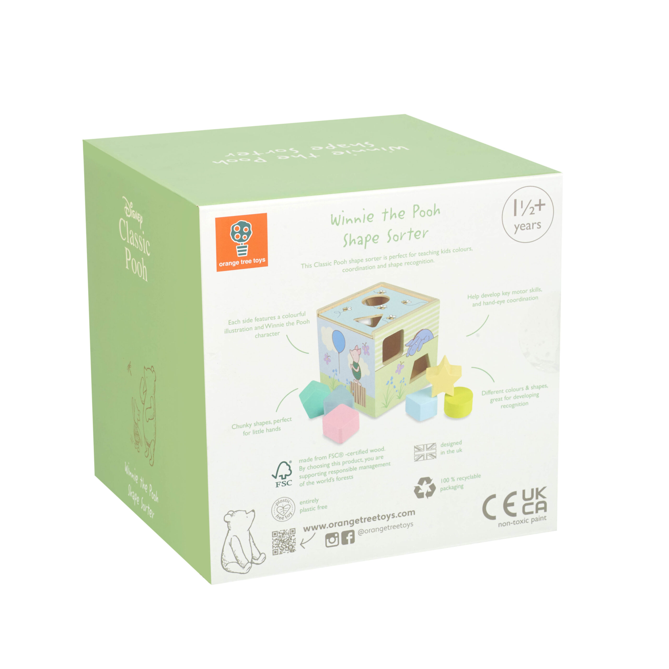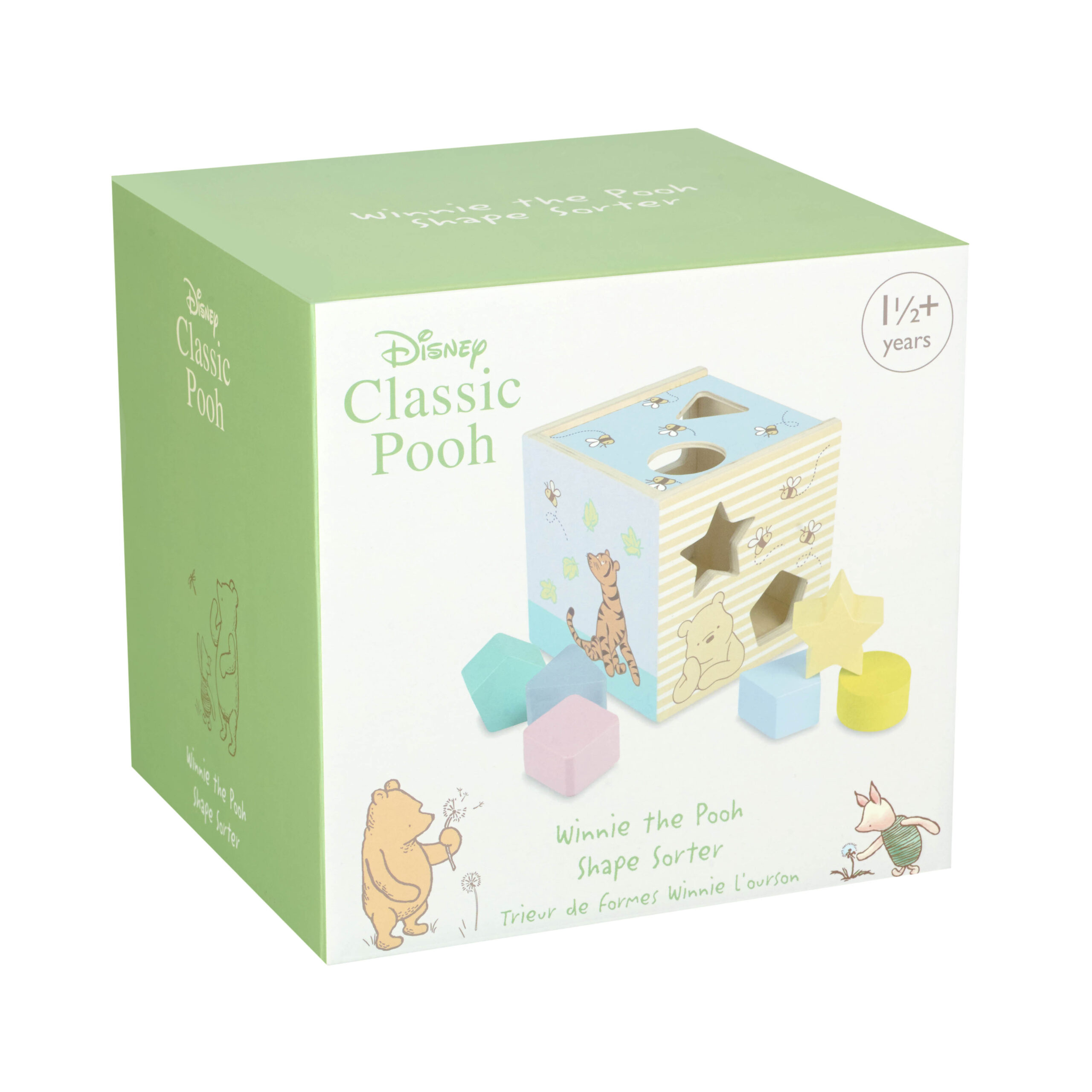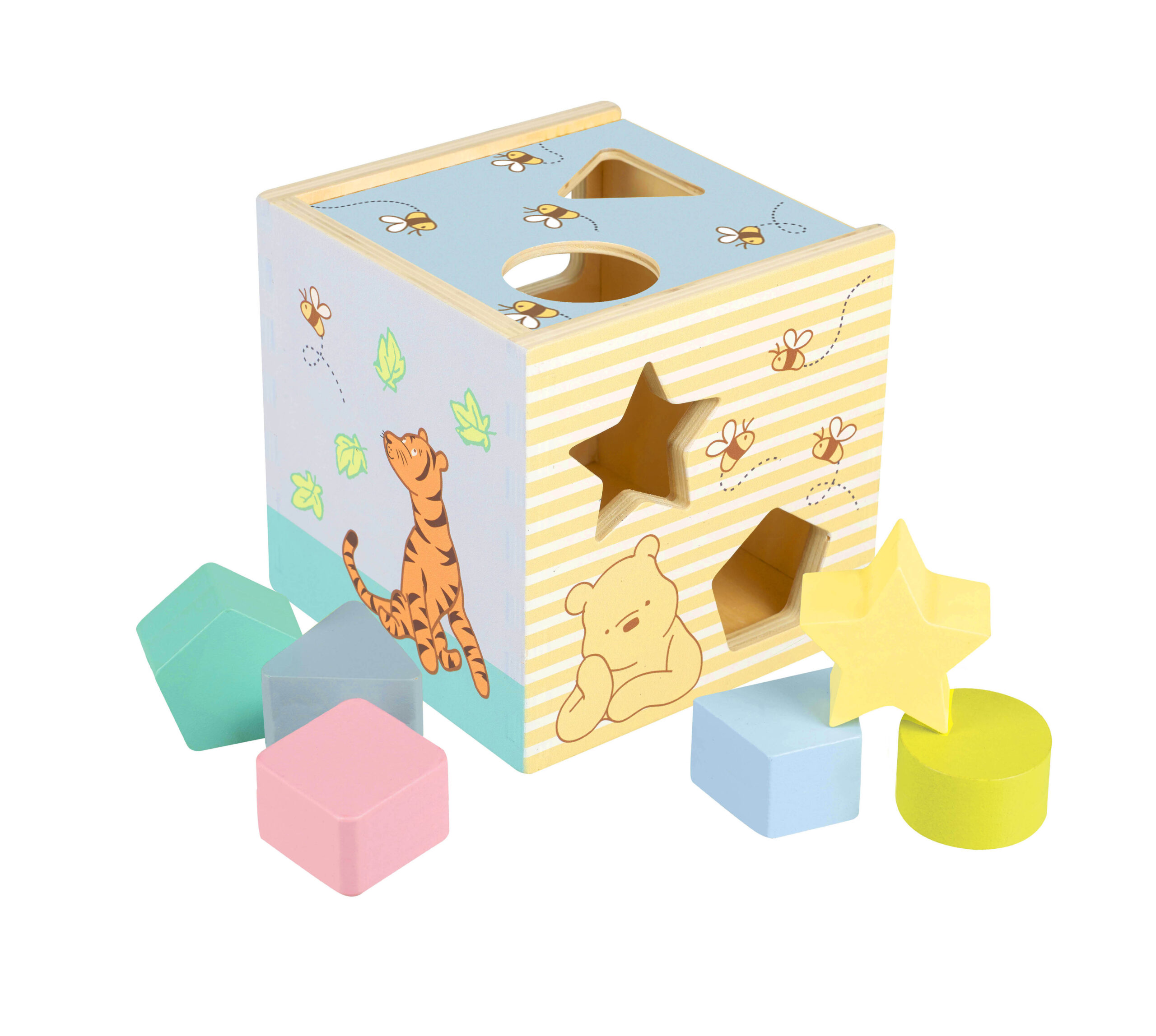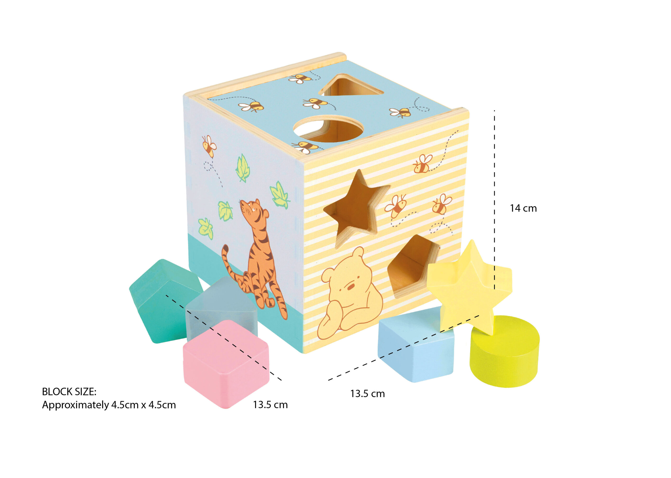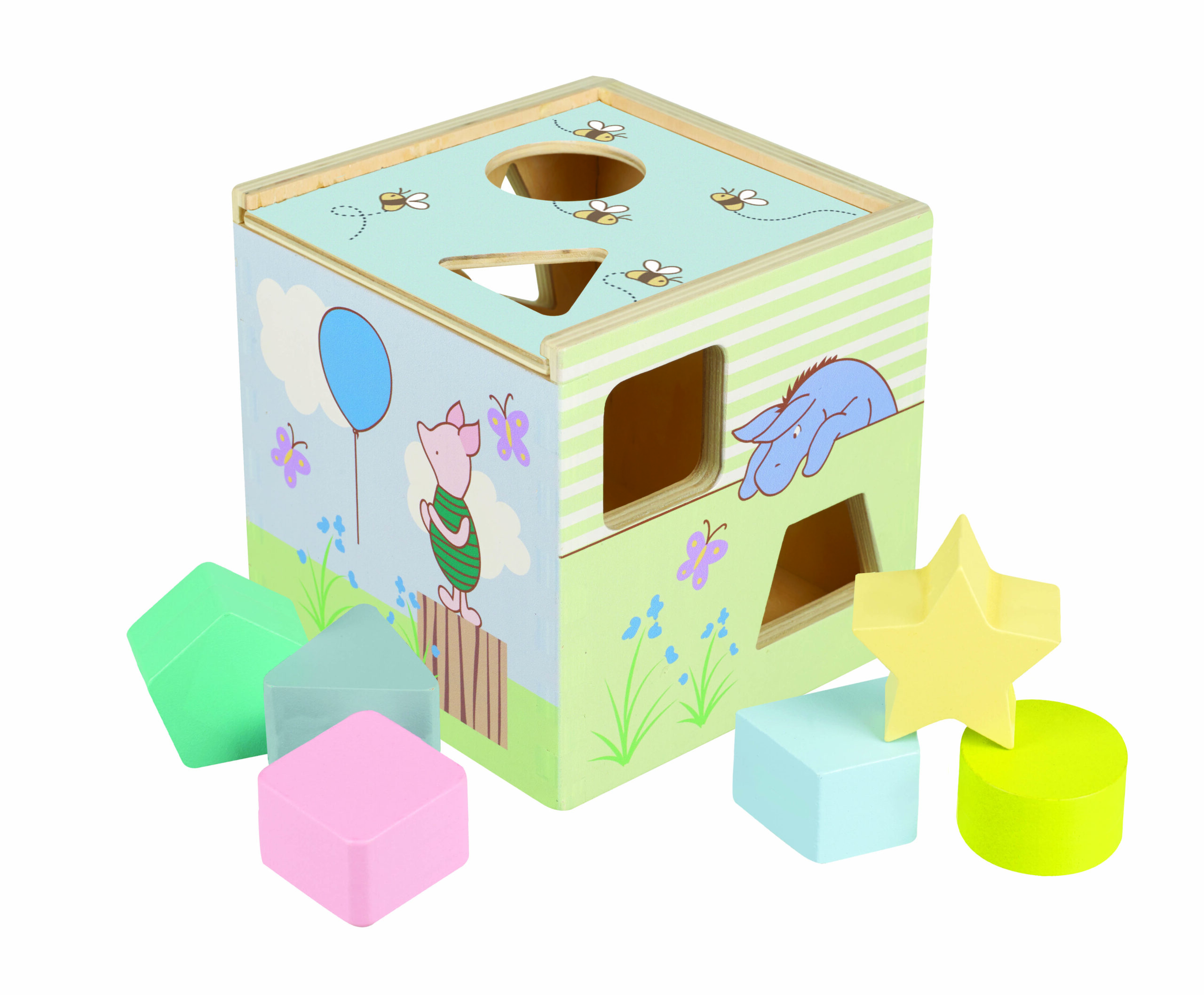 A.A. Milne’s timeless stories about a boy, a bear, and his friends from the Hundred Acre Wood have been delighting children for generations. This shape sorter is ideal for little hands. Beautifully painted in non-toxic paint, this traditional wooden toy features a different illustration on each side of the box and includes Pooh, Tigger, Eeyore, and Piglet.